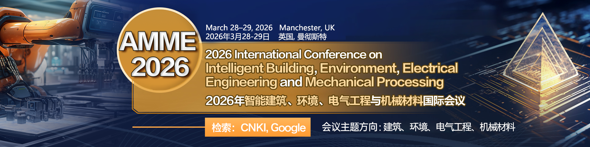 We are delighted to announce the 2026 International Conference on Intelligent Building, Environment, Electrical Engineering and Mechanical Processing (AMME 2026), which will be held in Manchester, United Kingdom, from March 28 to 29, 2026.
